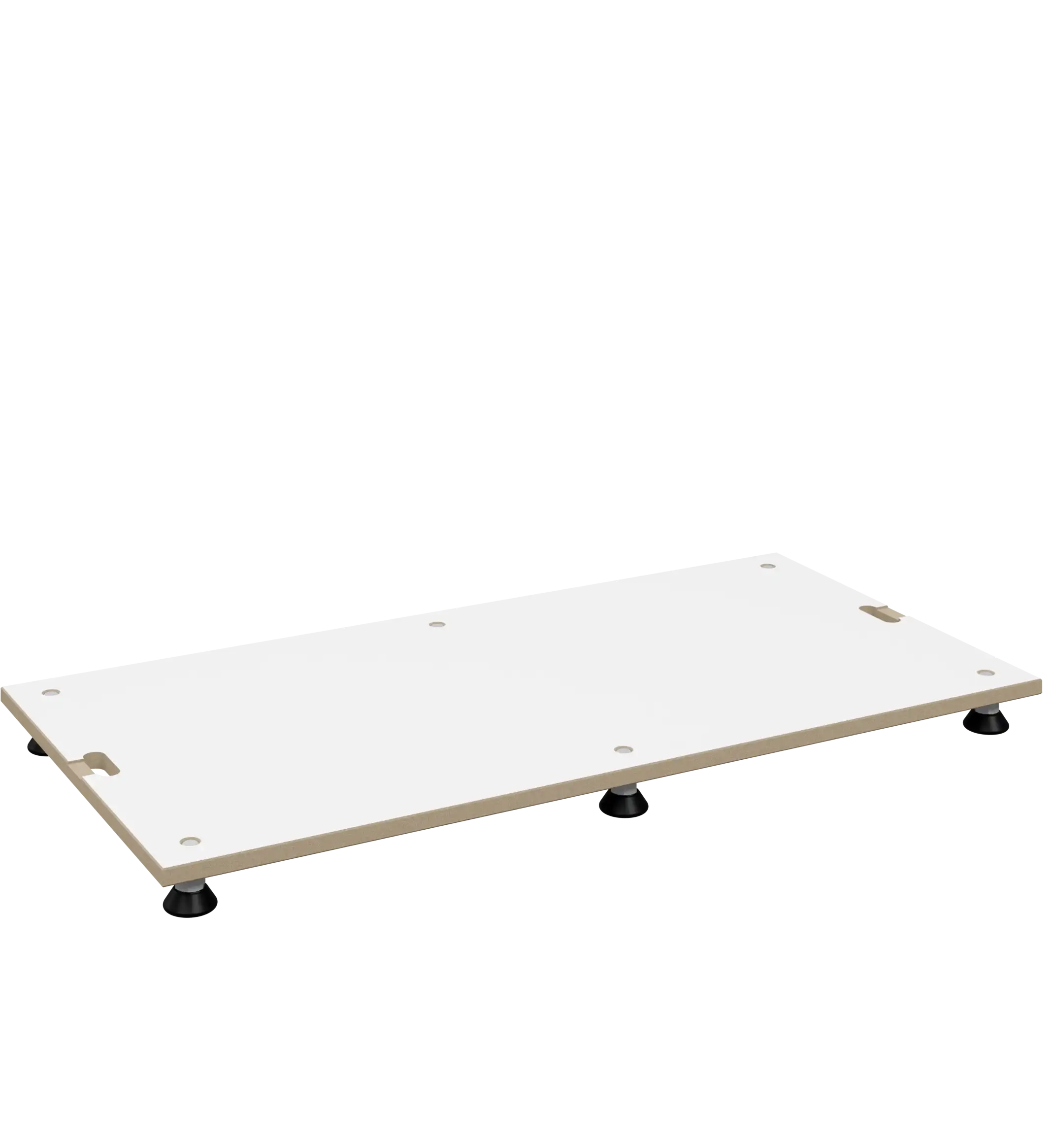Important note: Due to the long unsupported sides and the thickness of the material, the 1:2 modules, double width can deflect under heavier loads and should not be loaded with more than 7 kg in the middle. Therefore, they should ideally be positioned in the upper part of the shelf. If heavy objects are used on double-width modules (e.g. LP/DJ equipment), we recommend our cover plate or alternatively to use single width modules.