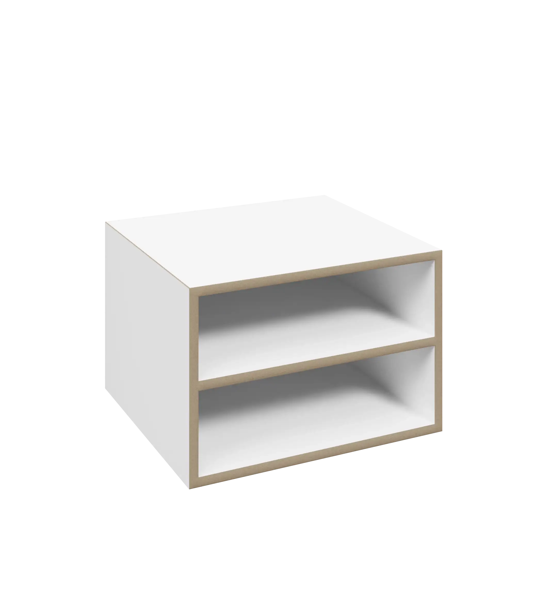 Le lot de deux tiroirs comprend deux tiroirs adaptés au cube F2, qui a la taille et le volume du module 2:3. Le matériau est, selon le choix, du MDF blanc avec un bord de couleur naturelle.